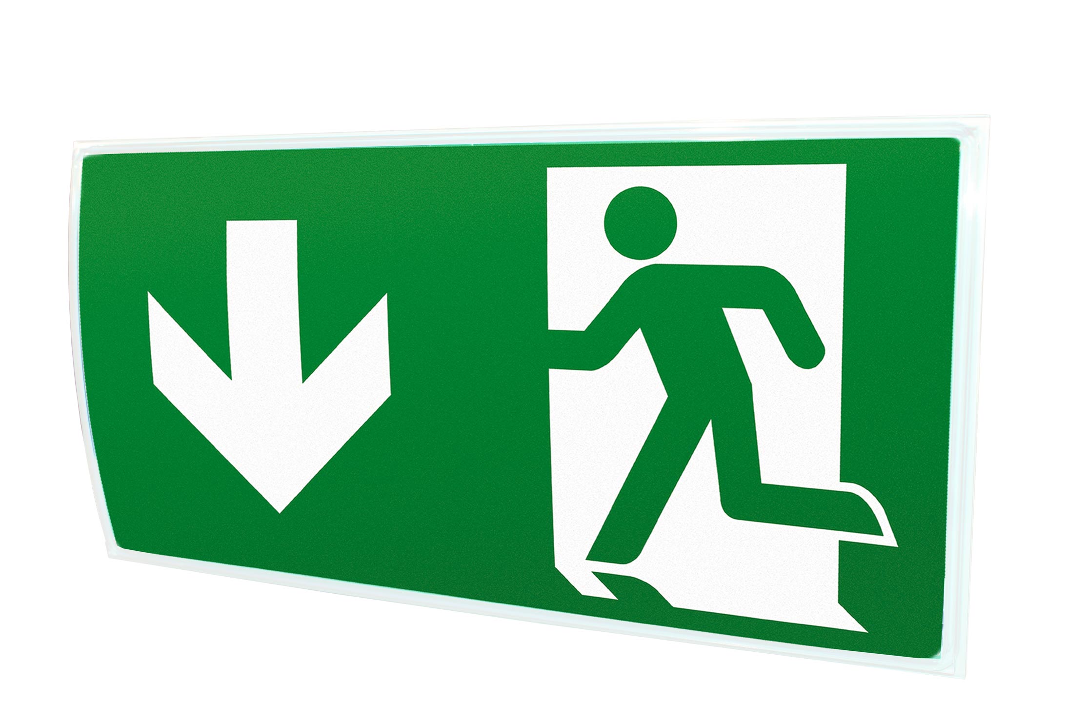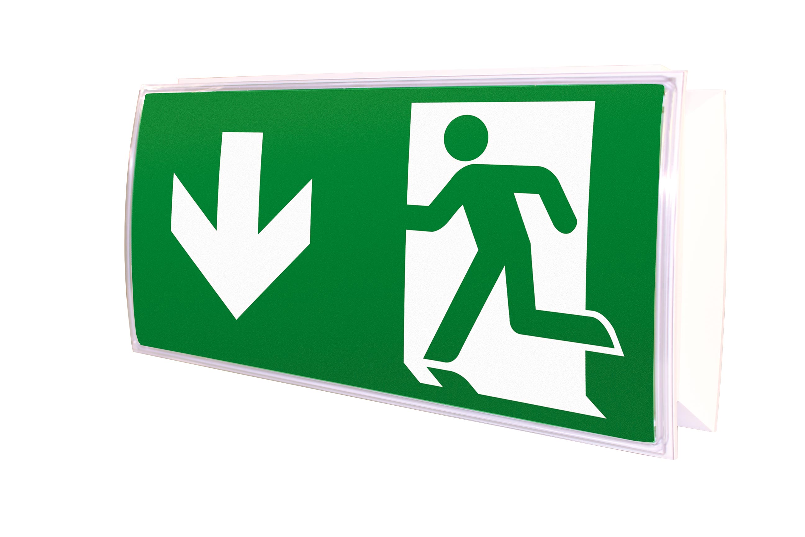 Konvexe Rettungszeichen- und Sicherheitsleuchte aus Kunststoff für Wand- oder Deckenmontage. Rettungszeichenleuchte mit steckbaren, lösungsmittelfreien, innenliegendem Piktogrammset standardmäßig im Lieferumfang enthalten.
