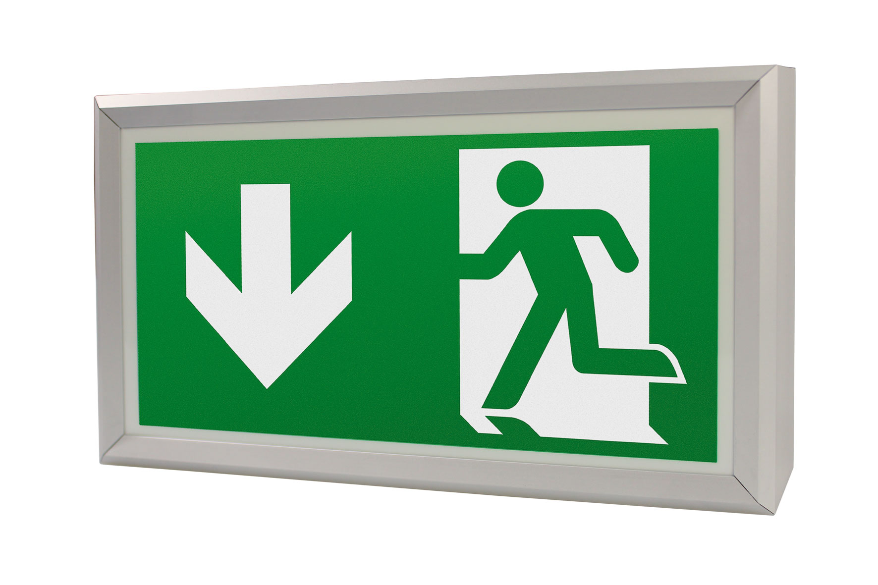Leuchte aus schlankem Aluminiumprofil, matt eloxiert, für Deckenmontage mit zusätzlichem Lichtaustritt nach unten. Werkzeuglos zu öffnendes Gehäuse. Geeignet für Dauer- oder Bereitschaftsschaltung. Planungssicherheit durch werkzeuglosen, variablen Einsatz der Piktogramme vor Ort.