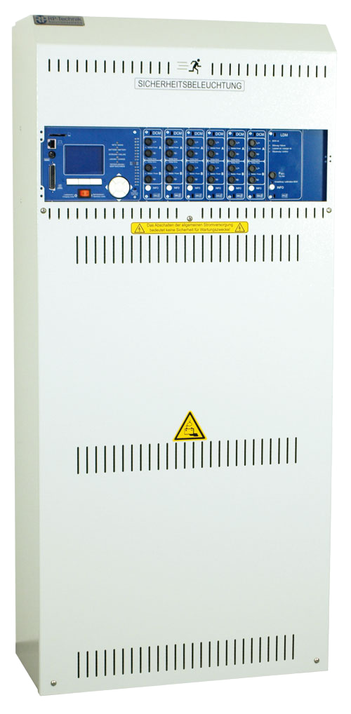 - Zentrales Stromversorgungssystem mit begrenzter Ausgangsleistung (LPS-System Low Power Supply System) im Umschaltbetrieb 230V/50Hz AC und 216V DC mit einer Leistung von 1500W/1h, 500W/3h oder 300W/8h laut ÖVE ÖNORM EN50171 und ÖVE/ÖNORM E 8002-1